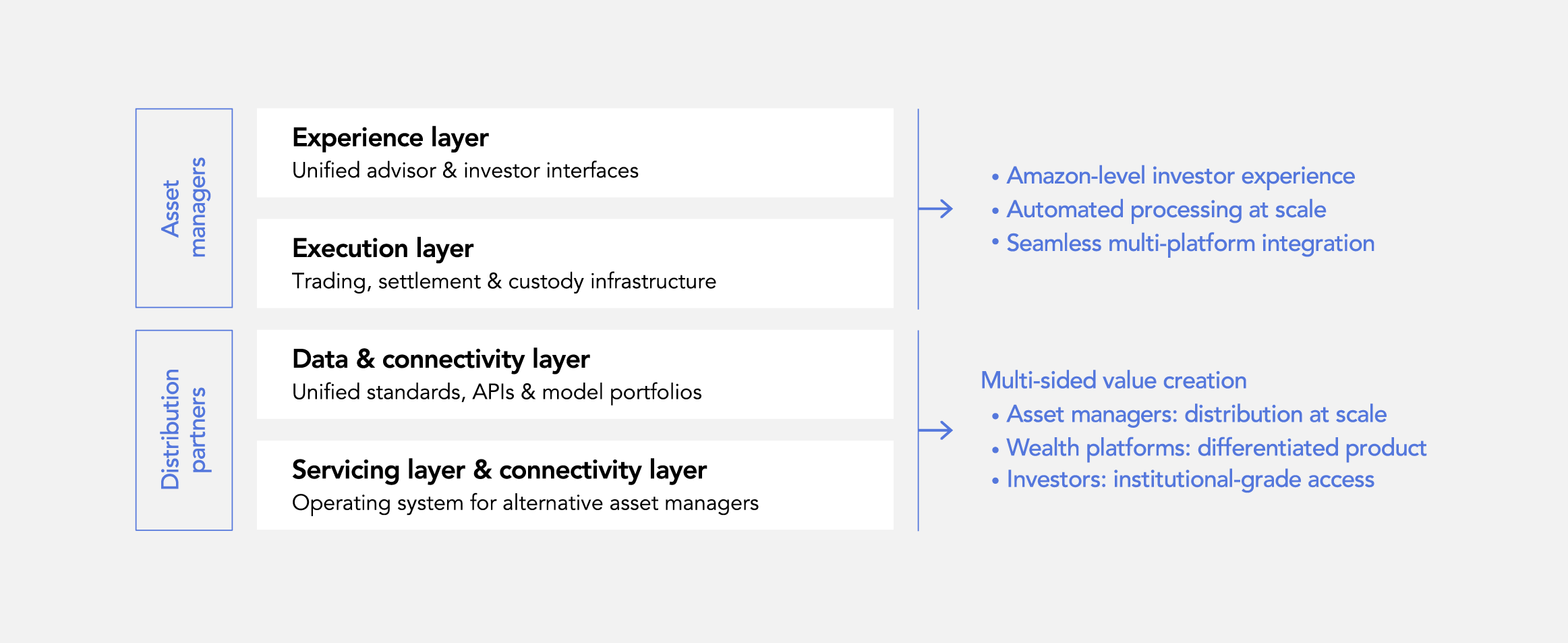 This architecture creates network effects on both sides. Asset managers accelerate scaled distribution. Wealth platforms access differentiated product without bespoke integration and manual intervention. As more participants join, the infrastructure scales gracefully and becomes more valuable to all participants.
